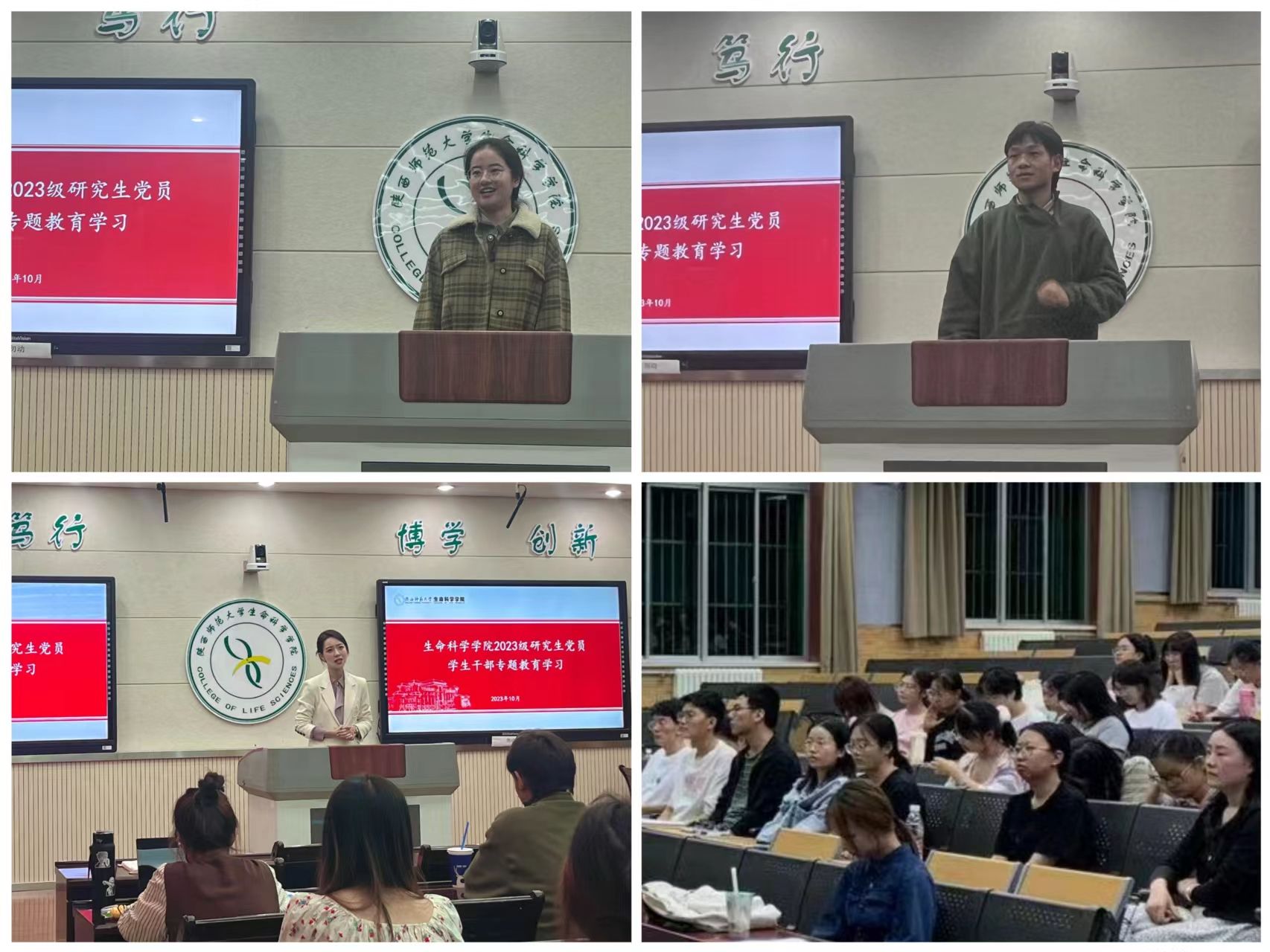 一是赓续红烛精神,培养拔尖创新人才。充分挖掘学科文脉、校史资源、院史院情引入新生教育活动,讲述“2023陕西省教书育人楷模”公司文学院教授张新科先进事迹,学校“西部红烛两代师表”奖获得者杨清源、章竹君、仰孝升优秀事迹,学院三位杰出员工“中国青年女科学家王红艳”、中国电影家协会儿童电影工作委员会会长郑虎、云南大学教授、俄罗斯自然科学院外籍院士段昌群生动鲜活的实践成就;邀请许执恒、杨崇林等知名专家学者与拔尖优秀学生代表与新生面对面开展5场学术报告,敦促研究生发扬科学家精神,继承“西部红烛两代师表”精神品质,树立“躬耕教坛、强国有我”的志向和抱负,努力争做可堪大用,能担重任的时代新人。二是激发奋斗精神,提升学生党员骨干素质能力。组织2023级研究生党员、学生干部专题教育,班风学风建设主题教育,研究生会宣讲;推动学科组、实验室文化、风气、架构建设,严格选聘标准、规范考核制度、优化激励政策,不断提升学生骨干整体素质。