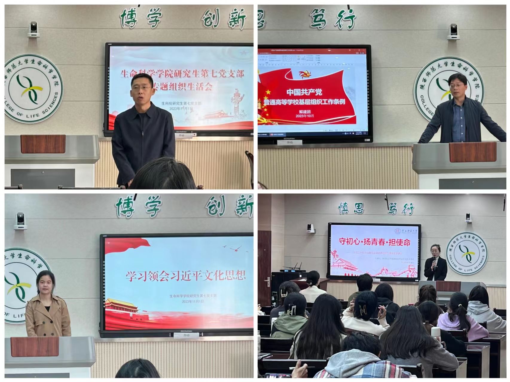 一是重要仪式教育。召开2023级研究生开学典礼,着力加强学生的青春使命教育与引导研究生新生自觉践行社会主义核心价值观,增强“四个意识”,坚定“四个自信”,深刻把握“两个确立”,自觉做到“两个维护”,坚定不移听党话、跟党走,努力成长为堪当民族复兴重任的时代新人。二是理论武装思想。深入学习领会习近平新时代中国特色社会主义思想、党的二十大精神、中华民族共同体意识、习近平文化思想、习近平生态文明思想、习近平总书记关于教育的重要讲话精神等。开展《扬帆破浪风正劲·踔厉奋发新征程—学习宣传贯彻党的二十大精神主题教育活动》,学院领导及学工组全体老师拍摄微党课视频《深入学习贯彻习近平生态文明思想,促进人与自然和谐共生》,邀请党的二十大精神博士理论宣讲团成员化学化工学院分析化学专业博士研究生李美琦作题为《守初心·扬青春·担使命》报告等,教育引导新生将个人发展与党和国家的发展同频共振,赓续使命勇担当。三是党员教育管理。核查党员档案、入党发展启蒙、召开组织生活会,学习习近平文化思想,编印党员学习资料《中国共产党宣传工作史(五)》等。