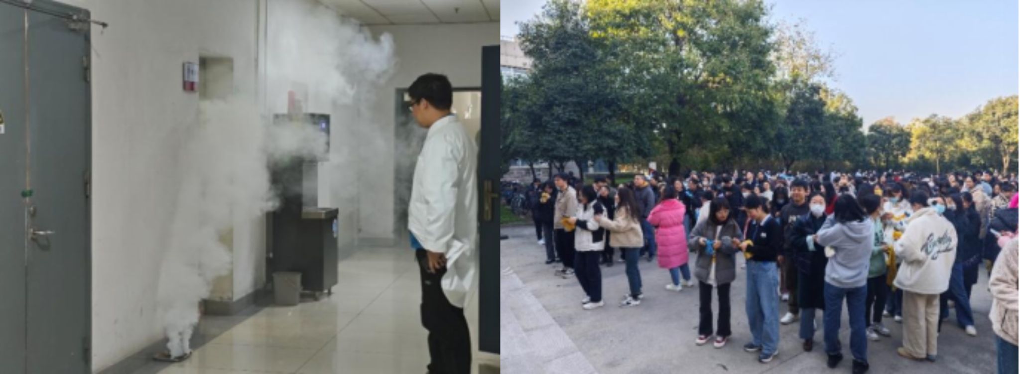 伴随浓烟升起,安全疏散演练正式开始,全体师生按照应急逃生预案,用毛巾捂住口鼻,沿着楼梯通道,有序撤离到实验室外空旷的安全地带。