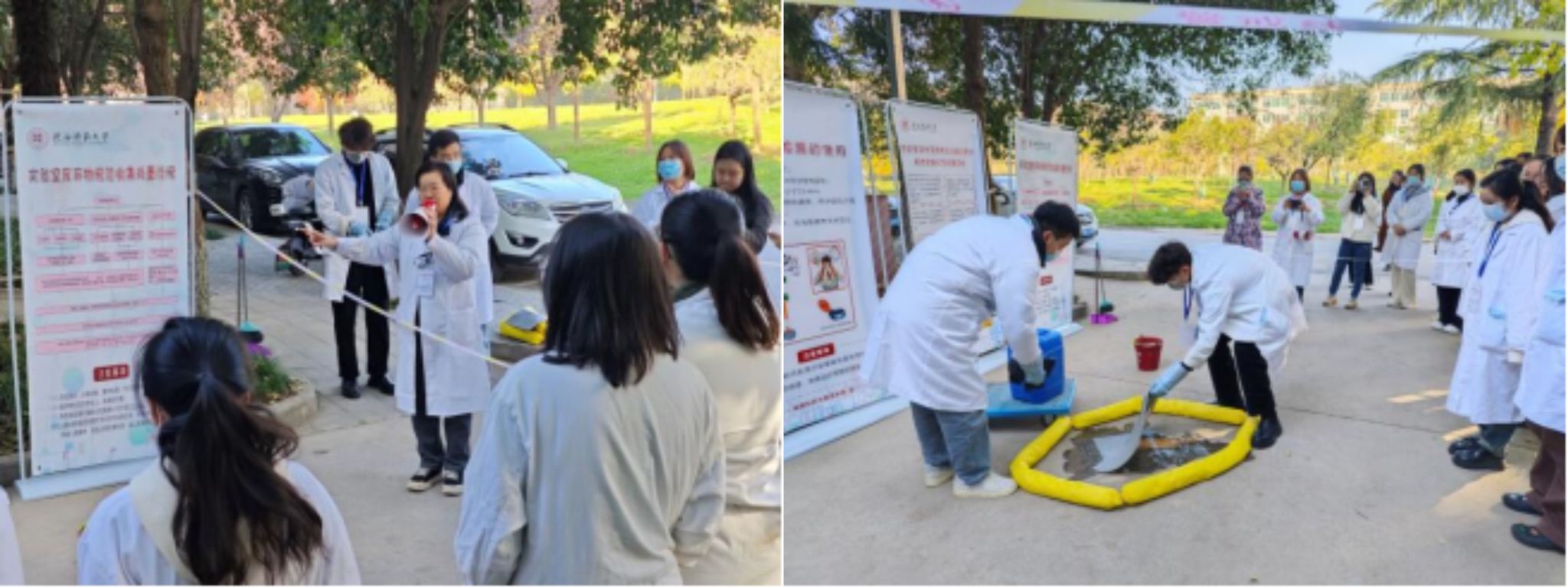 随后,实验室危险废弃物暂存间的管理老师和志愿者们,向各科研实验室学生安全员讲解并演示了有机废液和酸性试剂泄漏事故规范化的应急处置过程。